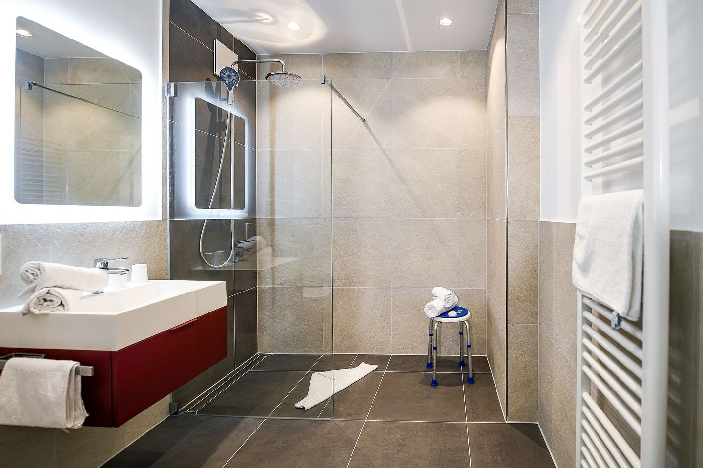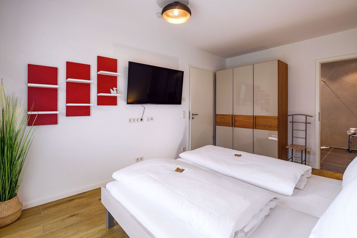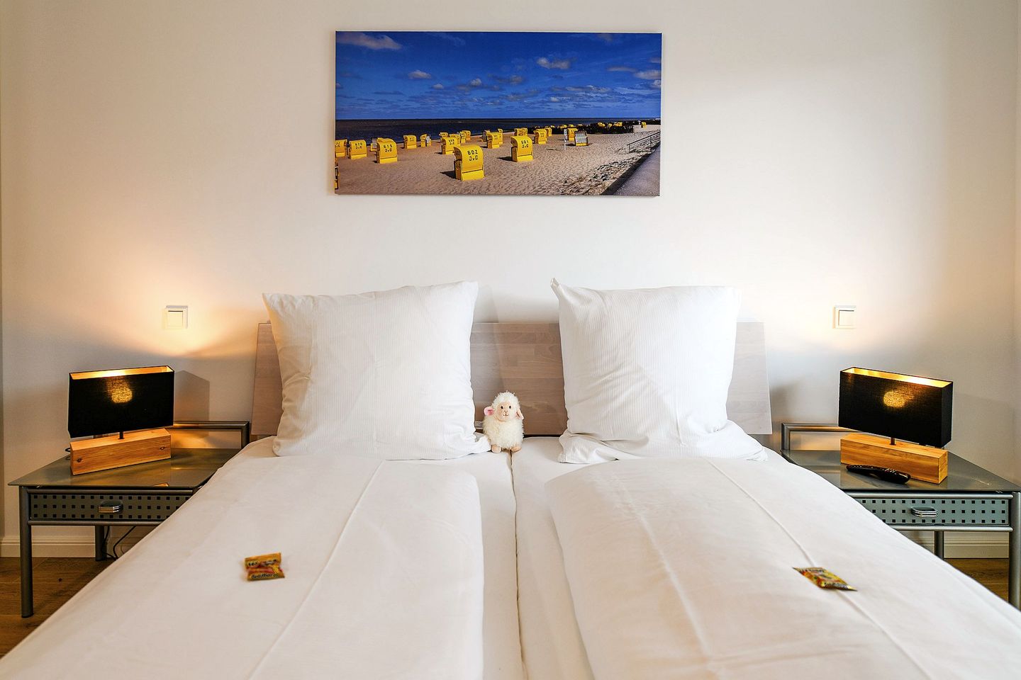 Die helle Zwei-Raum-Wohnung für 2 Personen bietet ein stilvolles Schlafzimmer mit hochwertigem Doppelbett und TV, einen offenen Wohn- und Essbereich mit Smart-TV sowie eine voll ausgestattete Küchenzeile. Das großzügige Bad verfügt über eine bodengleiche Dusche mit Duschhocker, Fußbodenheizung und modernen Komfort. Auf der möblierten Terrasse können Sie wunderbar entspannen, die Sonne genießen und die frische Nordseeluft spüren. Ein kostenfreier Tiefgaragenstellplatz (Nr. 126) und ein Fahrradabstellplatz stehen ebenfalls zur Verfügung.