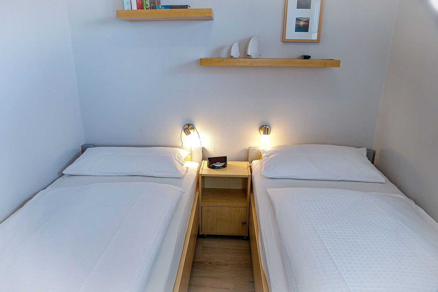Belüftbarkeit SZ schlecht, weil zum Wandelgang gelegen. Betten 2, sehr schmal. WZ bei Regen nicht belüftbar. Selber Kochen eher nicht wegen fehlender Möglichkeit zum Lüften. Ansonsten muss man sagen: der Platz ist optimal genutzt und die Aussicht vom Esstisch aus phänomenal. Praktisch auch der Autostellplatz gleich am Haus. Brötchenkauf am Morgen im Haus, kein Autoverkehr...ein Traum.