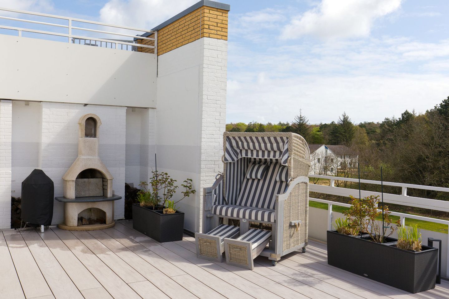 Das Haus bietet einen großzügigen Wellnessbereich mit Schwimmbad (29 °C, Gegenstromanlage), Sauna, Dampfbad und Ruheraum mit Zugang zum Innenhof. Die gemeinschaftliche Dachterrasse des Hauses lädt mit Strandkörben und Weitblick bis zur Insel Neuwerk zum Verweilen ein.