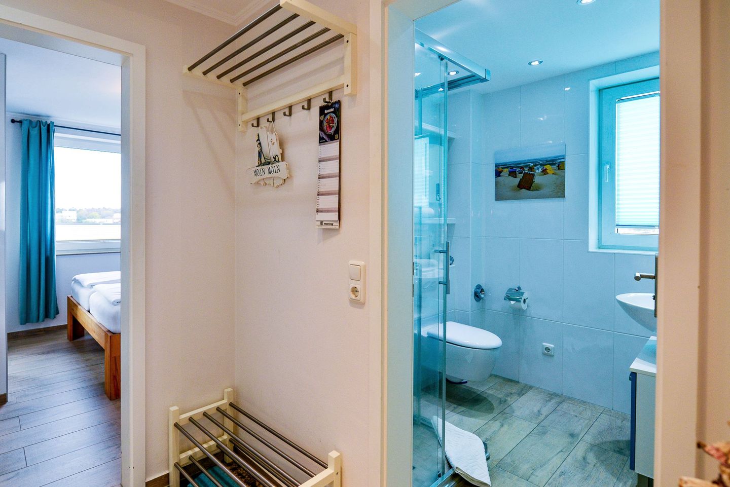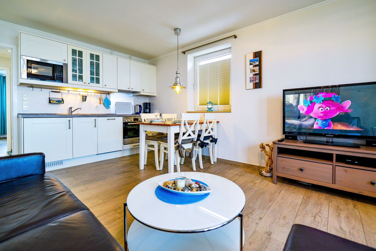Die Wohnung verfügt über ein separates Schlafzimmer mit Doppelbett sowie ein Schlafsofa im Wohnbereich. Die moderne Küche ist voll ausgestattet und lädt zur Selbstverpflegung ein. Zwei Flatscreen-TVs, kostenfreies WLAN und Fußbodenheizung sorgen für Komfort – auch an kühlen Tagen. Das helle Bad mit Tageslicht ist mit einer ebenerdigen Dusche ausgestattet.