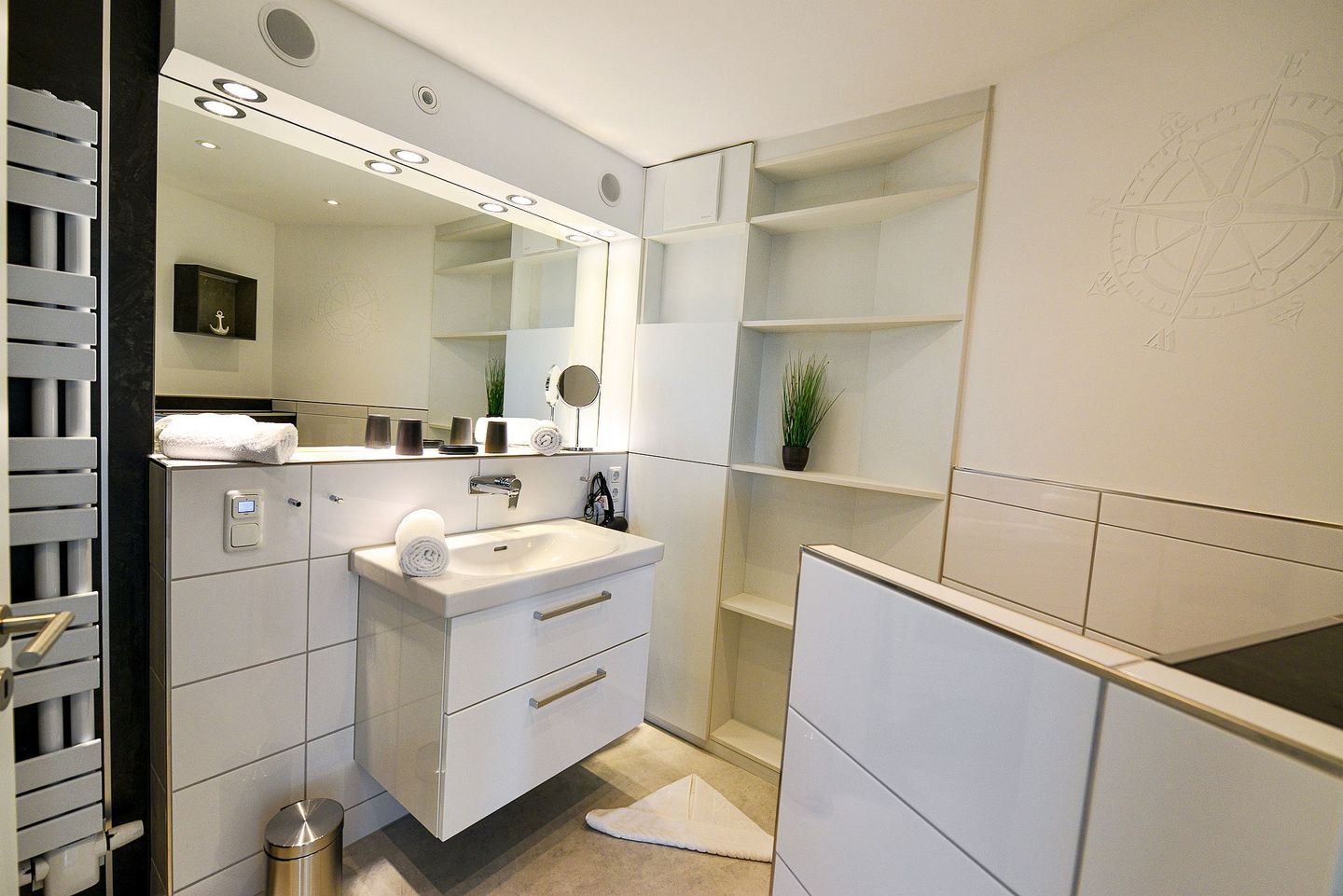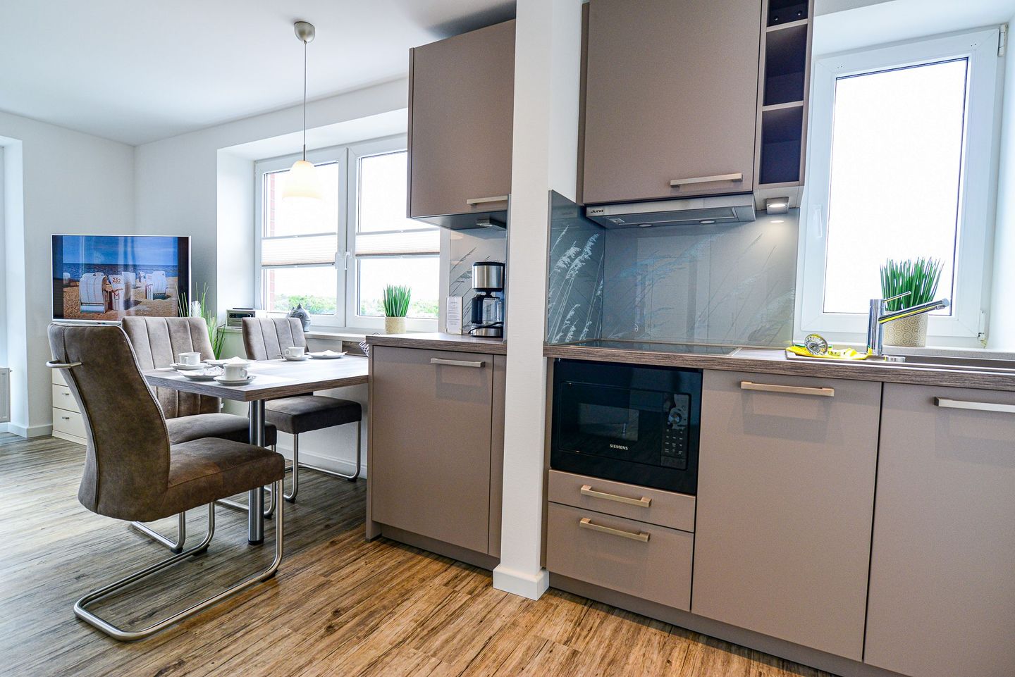 Die vollwertige Ausstattung der Ferienwohnung wird Sie keine Annehmlichkeiten des Alltags vermissen lassen und bietet Ihnen alles, was Sie für einen Urlaub ohne Abstriche an der Nordsee benötigen. Die schöne und vollwertige offene Küchenzeile eignet sich, um auch aufwendigere Gerichte zuzubereiten und typische nordische Gerichte auszuprobieren, der Wohnbereich lädt zu gemütlichen Abenden vor dem Flatscreen TV ein und das schöne Bad garantiert Erholung und neue Energie an jedem Ihrer Urlaubstage.