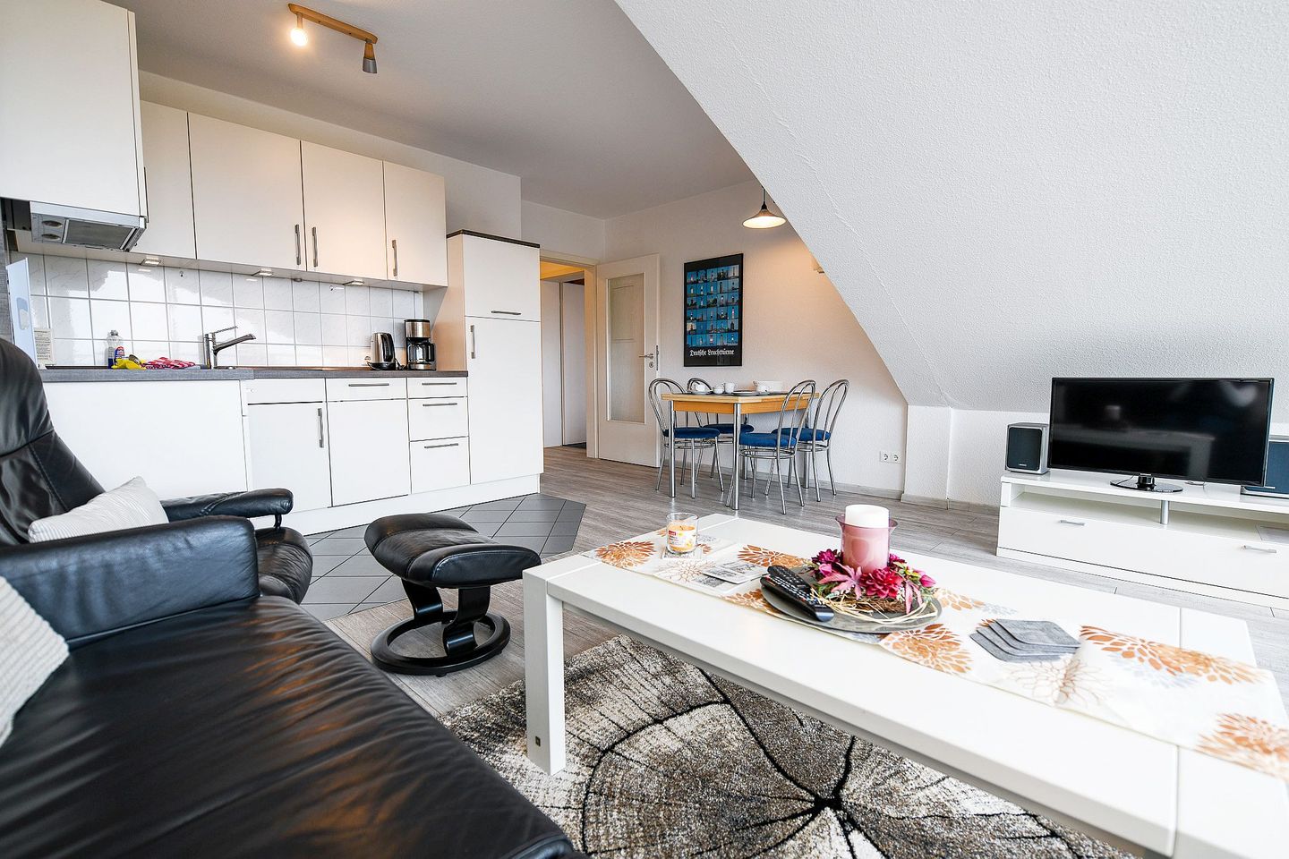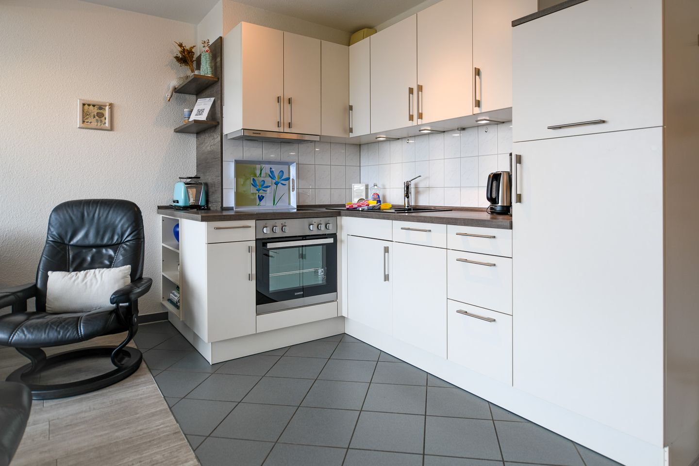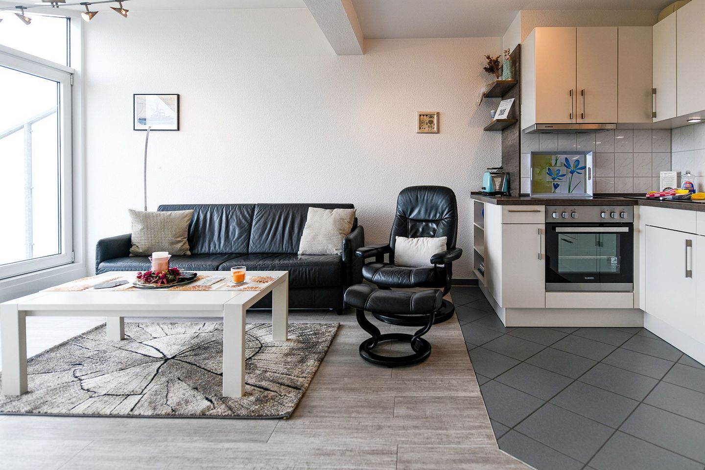 Die Wohnung verfügt über eine voll ausgestattete Küchenzeile sowie ein neues, modernes Bad mit ebenerdiger, großzügiger Dusche und WC – ideal für einen erholsamen Start in den Urlaubstag. Die Ferienwohnung ist Nichtraucher- und garantiert haustierfrei.
