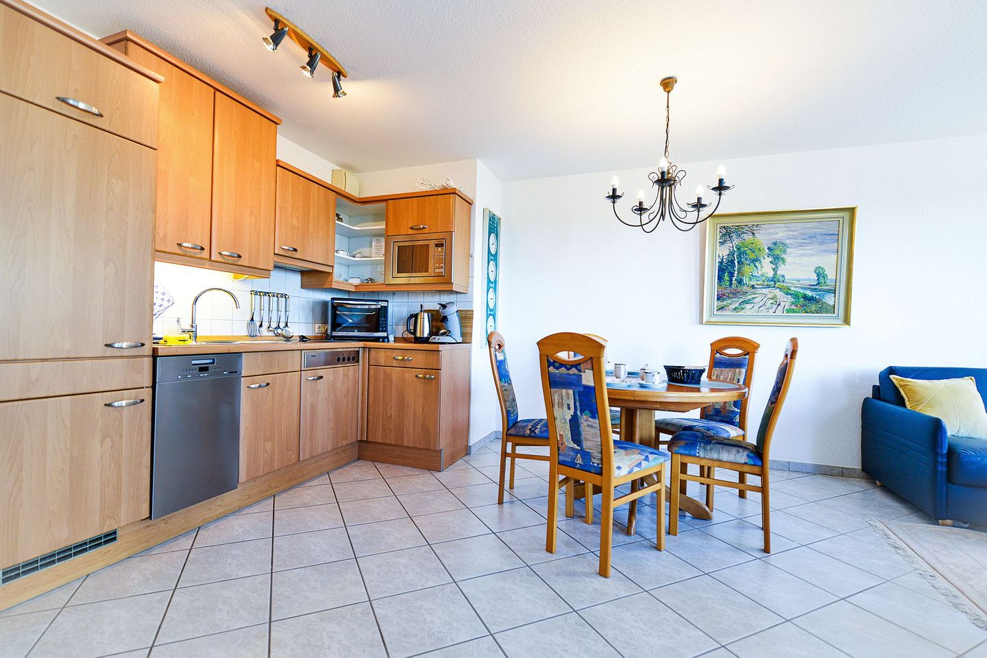 Die helle, großzügige Ferienwohnung bietet Komfort für Paare und kleine Familien. Die voll ausgestattete Küche verfügt über eine Miele-Geschirrspülmaschine, großen Kühlschrank mit Gefrierfach und Senseo-Kaffeemaschine. Im gemütlichen Wohnzimmer sorgen neue Couchgarnitur, Flachbild-TV und WLAN für entspannte Stunden. Das Badezimmer mit Badewanne lädt zum Erholen ein, ein eigener Abstellraum bietet zusätzlichen Stauraum.