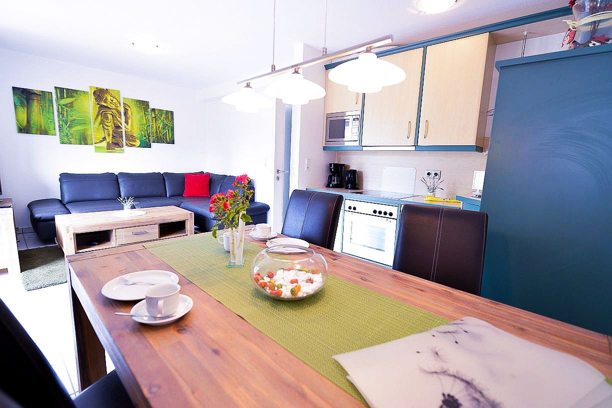 Schöne FeWo mit toller Terrasse in ruhiger Lage. Schön ist auch, dass die Terrasse überhaupt nicht einsehbar ist, obwohl sie zur Straße hin liegt. Küchenausstattung für 4 Personen gut. Tolle, massive Möbel, große Couch. Wir würden wiederkommen.