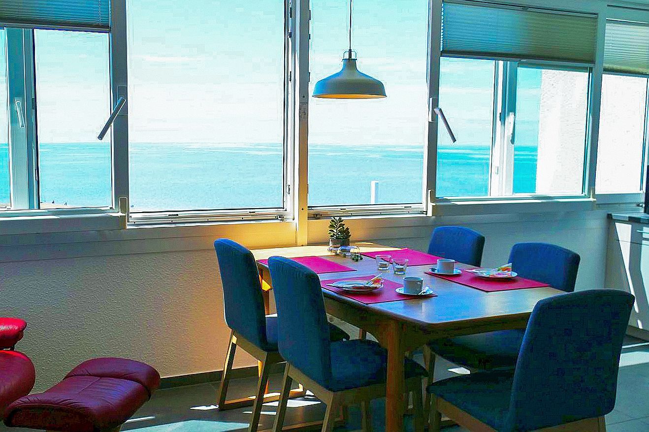 Die 50m² große und lichtdurchflutete Ferienwohnung bietet Ihnen eine hochmoderne Ausstattung mit einer modernen, offenen und vollausgestatteten Küche, sodass Sie jeden Urlaubstag mit einem entspannten Frühstück mit direktem Blick aufs Meer beginnen können.