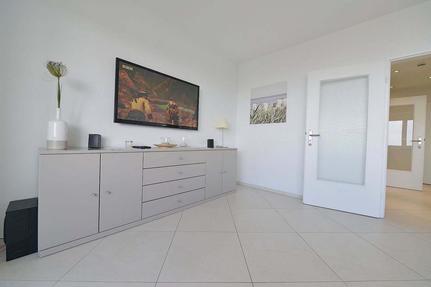 Die zwei Flatscreen TVs (Wohnzimmer 50 Zoll, Schlafzimmer 32 Zoll) und das integrierte WLAN sorgen für entspannte TV Abende, um sich vom langen Strandtag zu erholen.