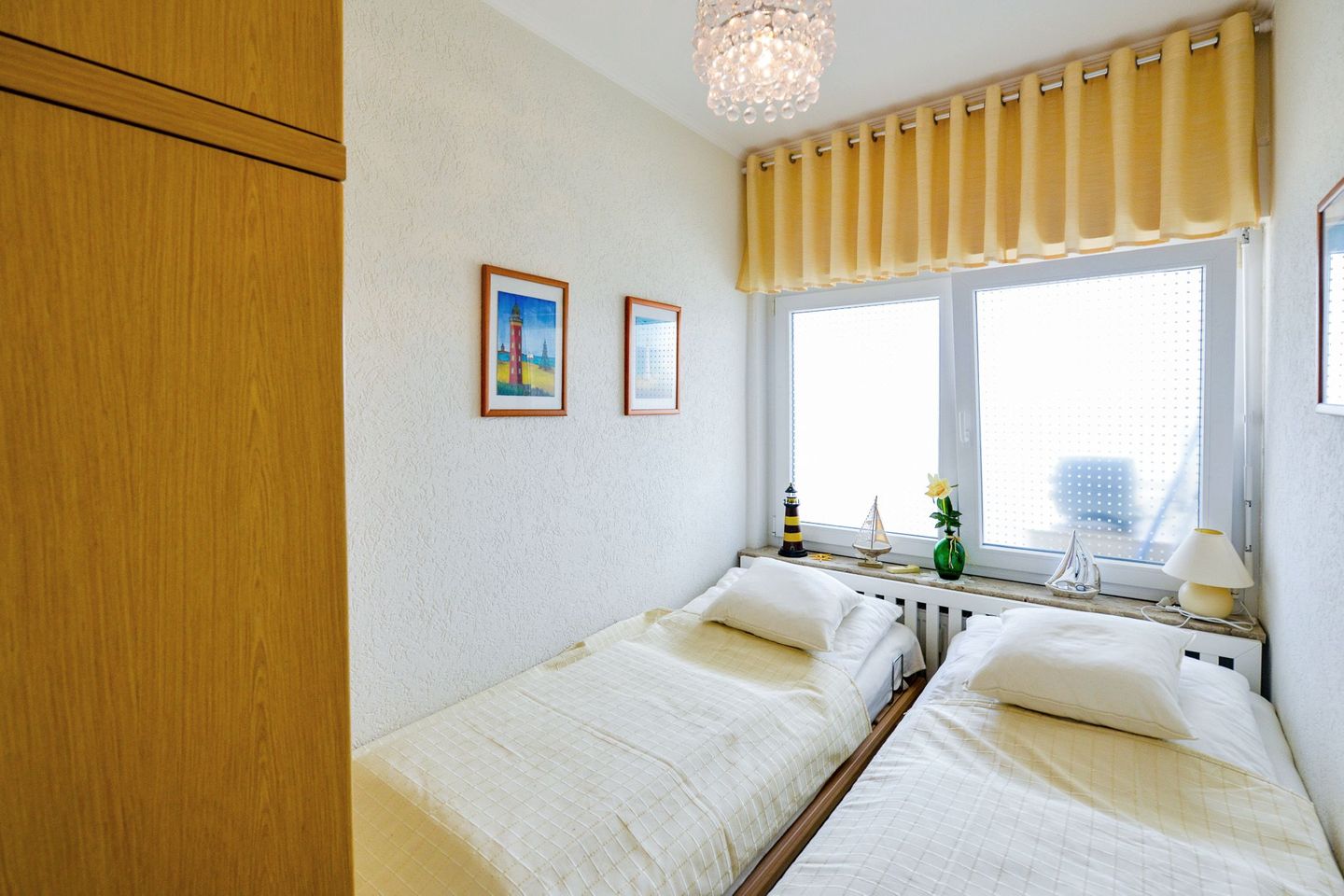 Ein separates Schlafzimmer ist mit zwei komfortablen Einzelbetten (auch zusammenfügbar) ausgestattet. Im Wohnbereich befinden sich zwei weitere Schlafplätze - 2 Einzelbettbetten - in einem Doppelschrankbett. Das gepflegte Badezimmer ist mit Badewanne und fester Duschwand ausgestattet. Die offene Raumaufteilung und die großen Fenster schaffen eine helle, freundliche Wohnatmosphäre. Vom Südbalkon mit seitlicher Seesicht, der sich öffnen lässt, genießen Sie entspannte Stunden mit Blick in Richtung Meer.