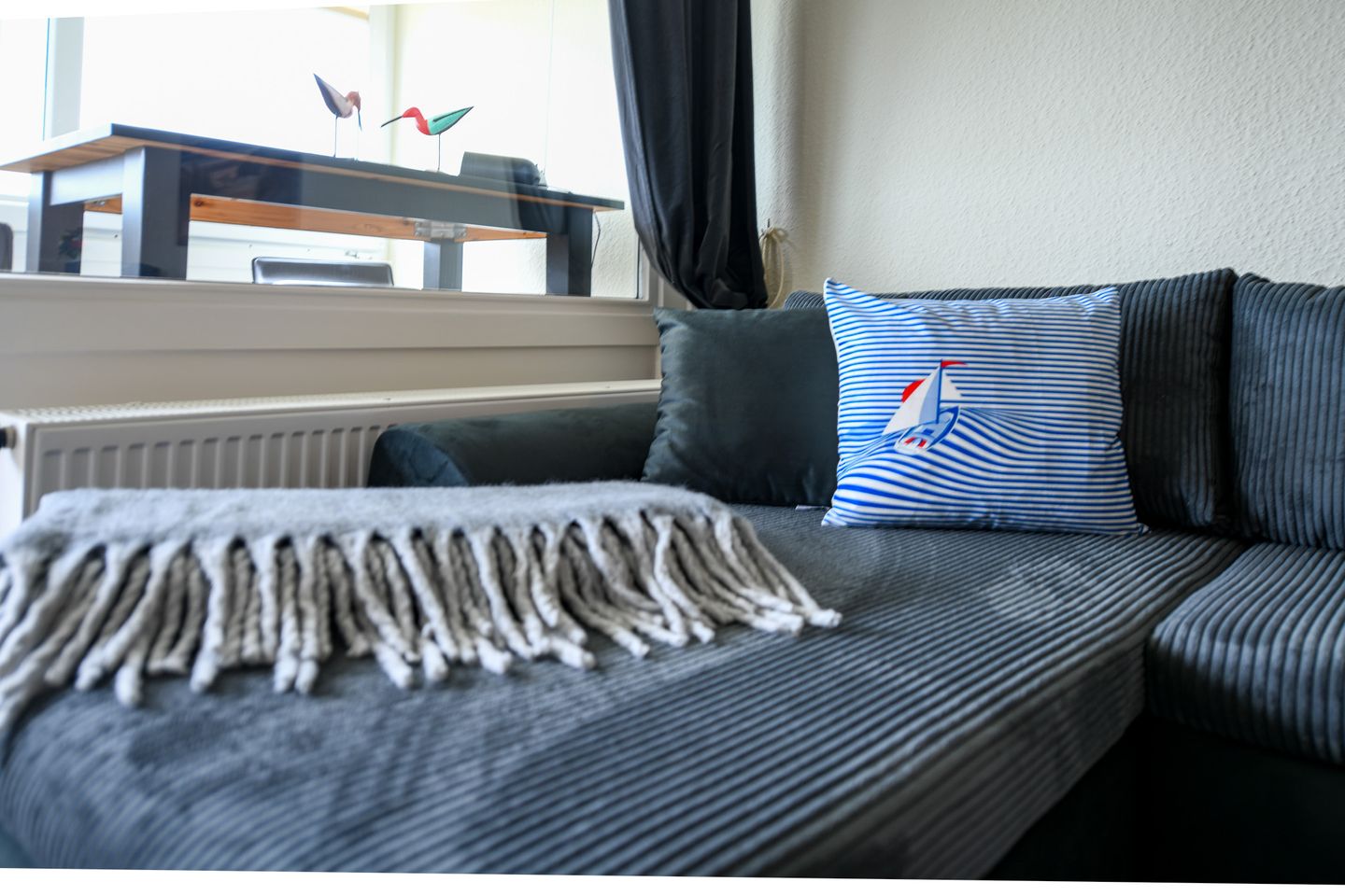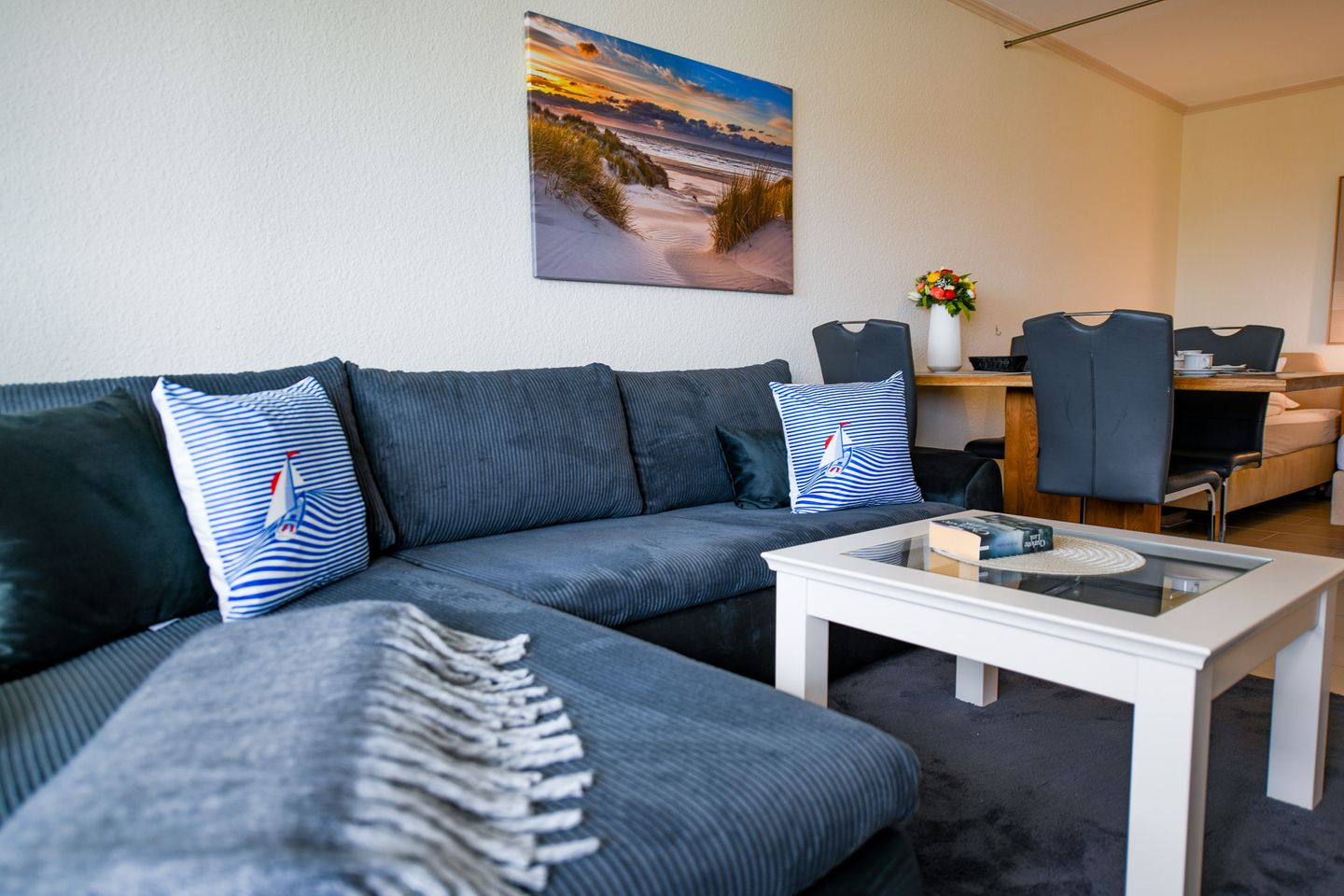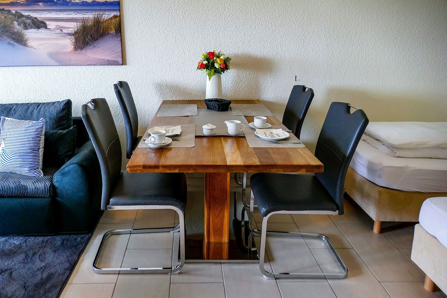 Die moderne Einrichtung und die offene, komplett ausgestattete Küchenzeile laden zum Wohlfühlen ein. Hier beginnt jeder Urlaubstag entspannt – zum Beispiel mit einem Frühstück am Fenster mit Blick auf das Wattenmeer.