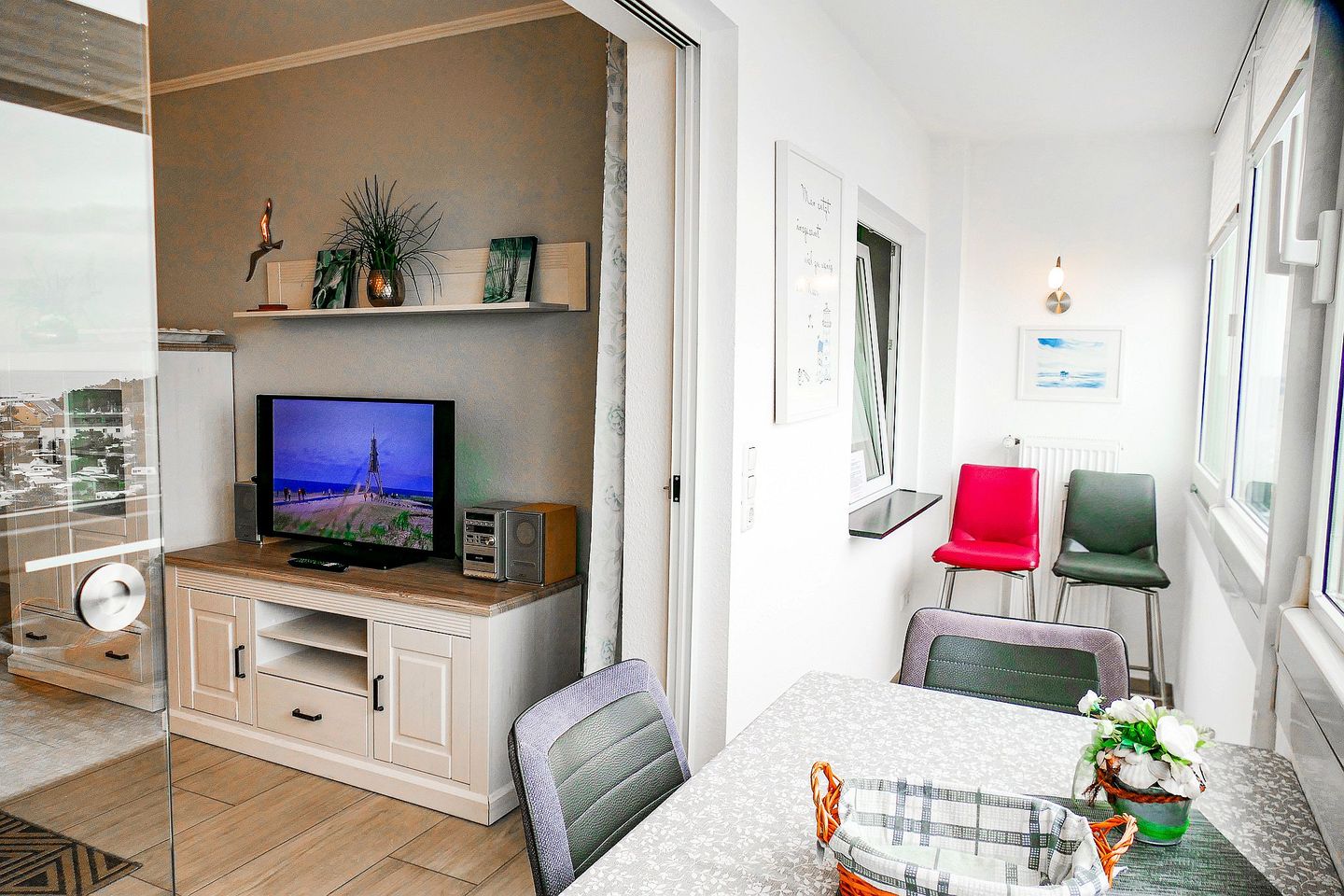 Ein besonderes Highlight dieser Ferienwohnung ist der verglaste und komplett zu öffnende Westbalkon, der Ihnen, von der 9. Etage aus, einen unvergesslichen Ausblick aufs Meer bietet.
